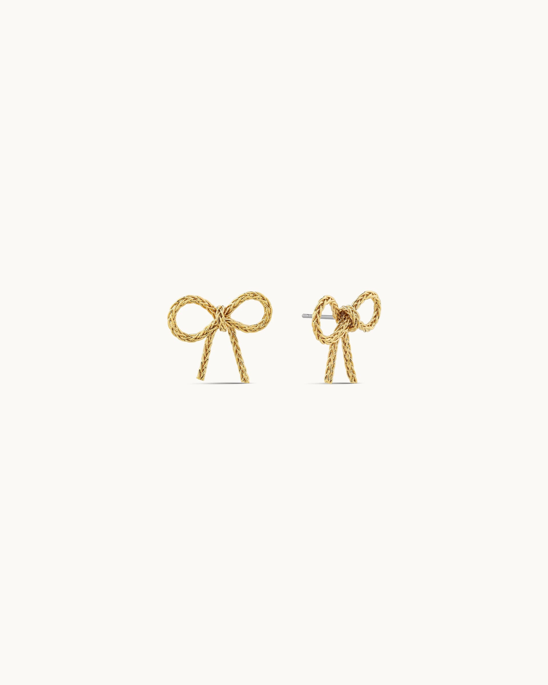 A playful yet refined design, these stud earrings feature a sculpted bow motif crafted with a textured, rope-like finish that adds depth and visual interest. The flowing lines and dimensional form create a charming balance between statement detail and elegant simplicity.