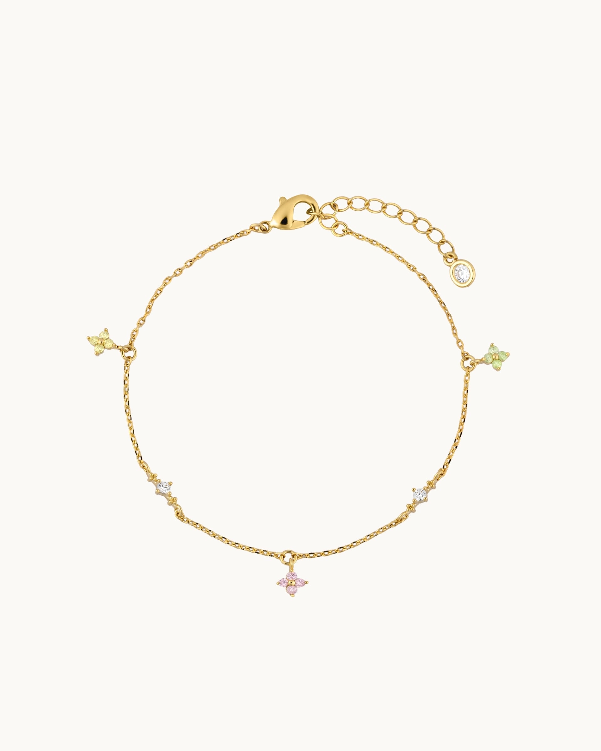 Elevate your everyday style with this delicate bracelet, designed with dainty floral charms accented by sparkling cubic zirconia stones. Each charm adds a subtle touch of elegance, making it a perfect blend of femininity and modern design.