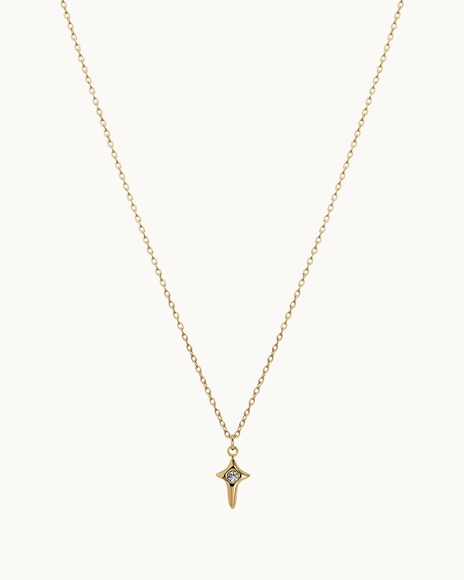 This necklace features a sleek elongated star pendant with a single sparkling stone at its core, giving it a modern, celestial-inspired look. Its smooth, tapered design creates a refined silhouette that adds a subtle touch of elegance to any outfit.