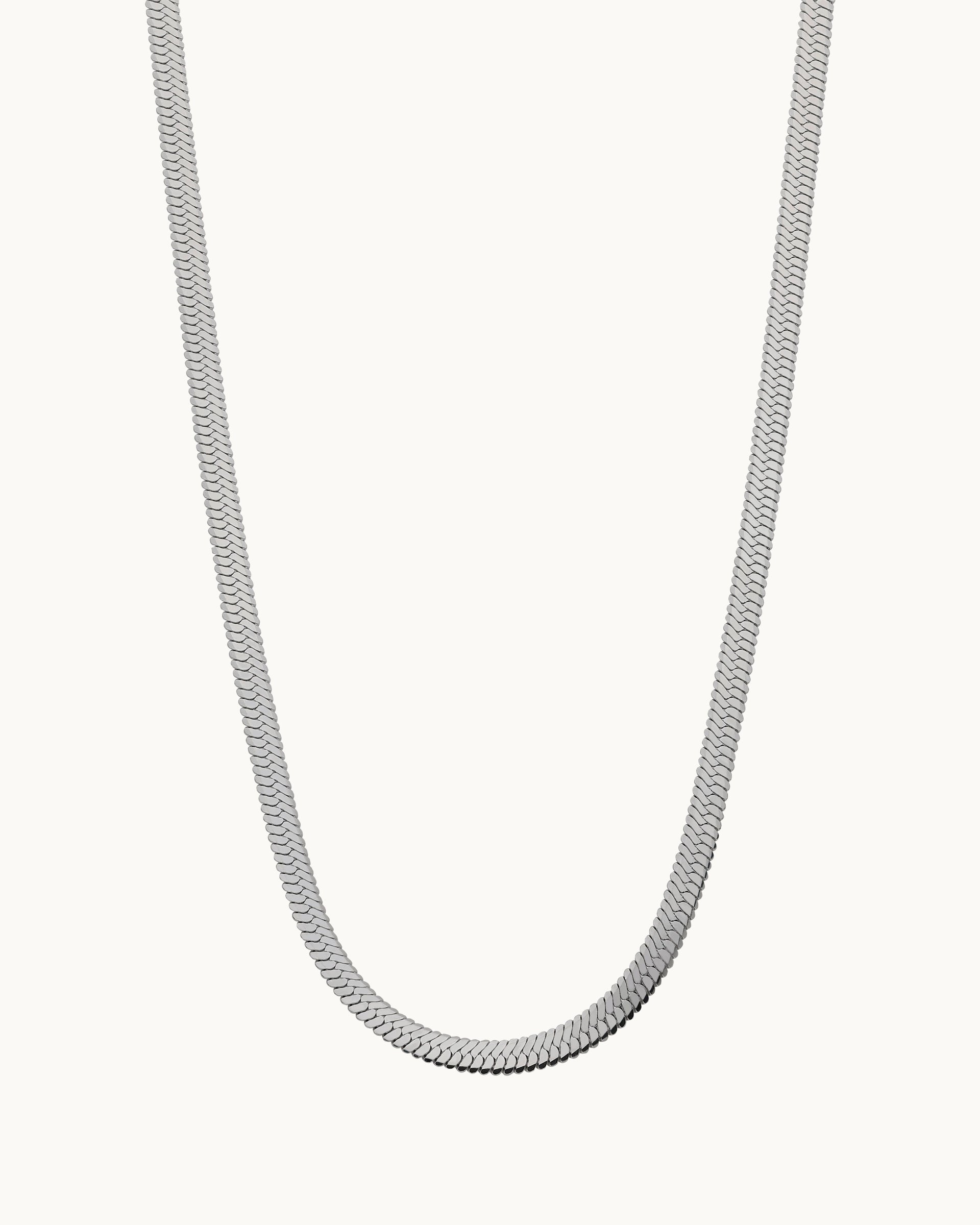 This sleek herringbone necklace brings a smooth, fluid shine to any look, designed with a refined flat-lay silhouette that sits elegantly along the neckline. Its minimalist profile makes it perfect for everyday wear or layering with your favourite chains.