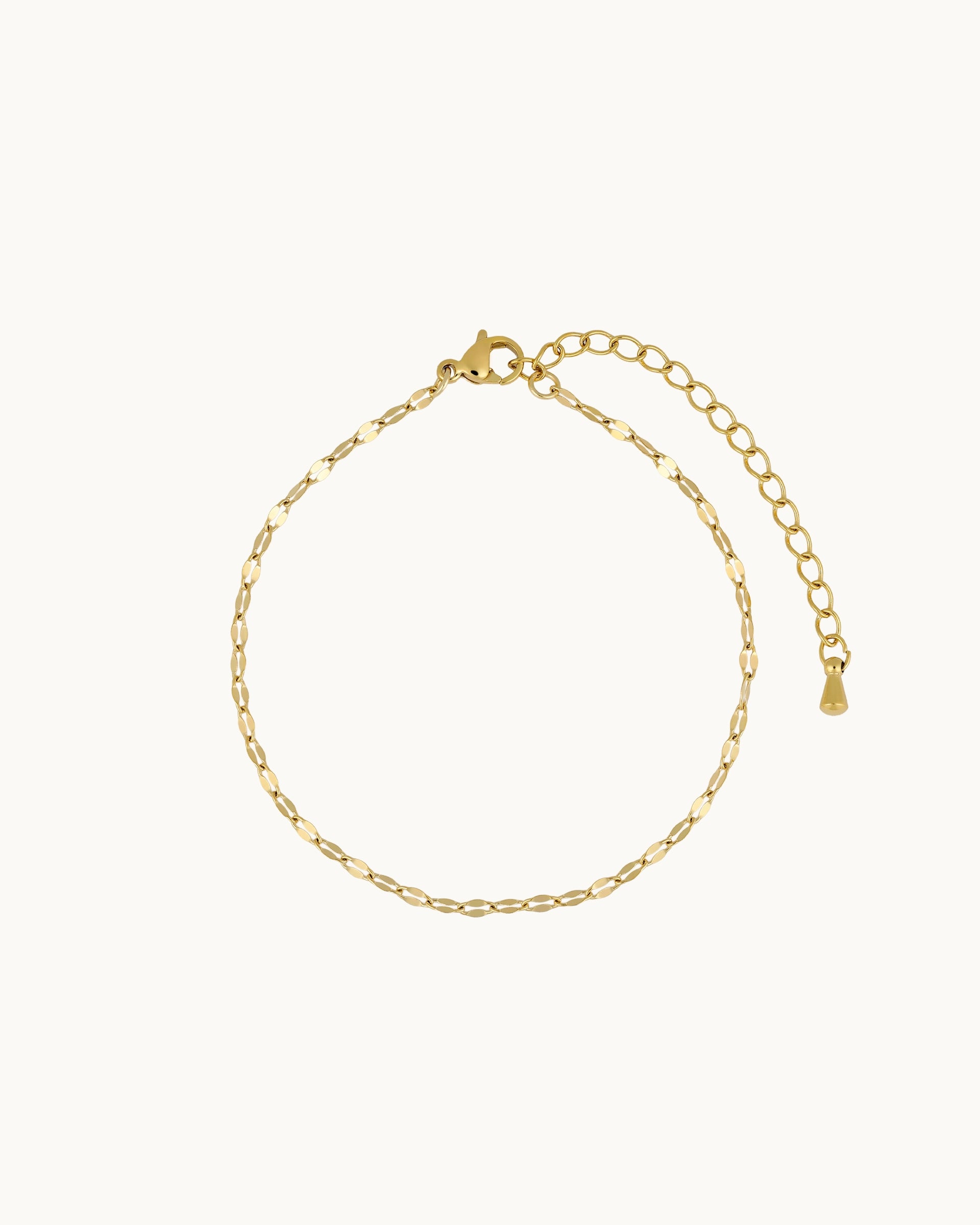 This bracelet features a delicate faceted chain that catches the light with a subtle shimmer, offering a clean and polished look that is effortless to style. Its slim profile makes it a versatile piece, perfect for layering or wearing on its own for a touch of understated elegance.